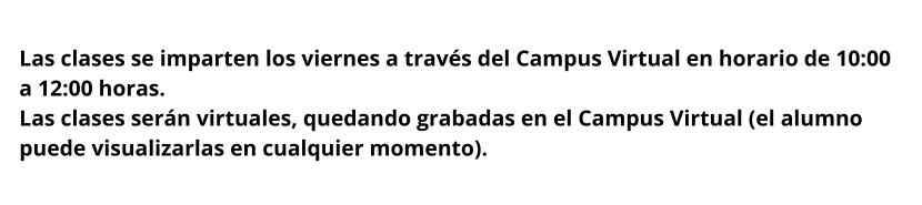 Horario: Las clases se imparten los viernes a través del campus virtual en horario de 10:00 a 12:00 horas. Las clases serán virtuales, quedando grabadas en el campus virtual (el alumno puede visualizarlas en cualquier momento).